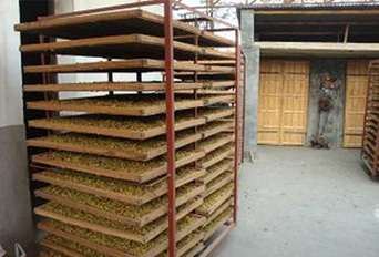1、階段,升溫階段:將裝好菊花的托盤,平整的放入烘箱,不能重疊,避免托盤放置不好造成不必要的漏風。關(guān)閉箱門打開熱風爐風機,點燃熱風爐,開始向箱內(nèi)送熱風,逐漸將箱內(nèi)溫度加熱至50°,加熱30分鐘~1.5小時,看箱內(nèi)有濕氣時,開始排潮,大約排潮2分鐘左右,排潮后箱內(nèi)溫度會有所下降,繼續(xù)供熱。